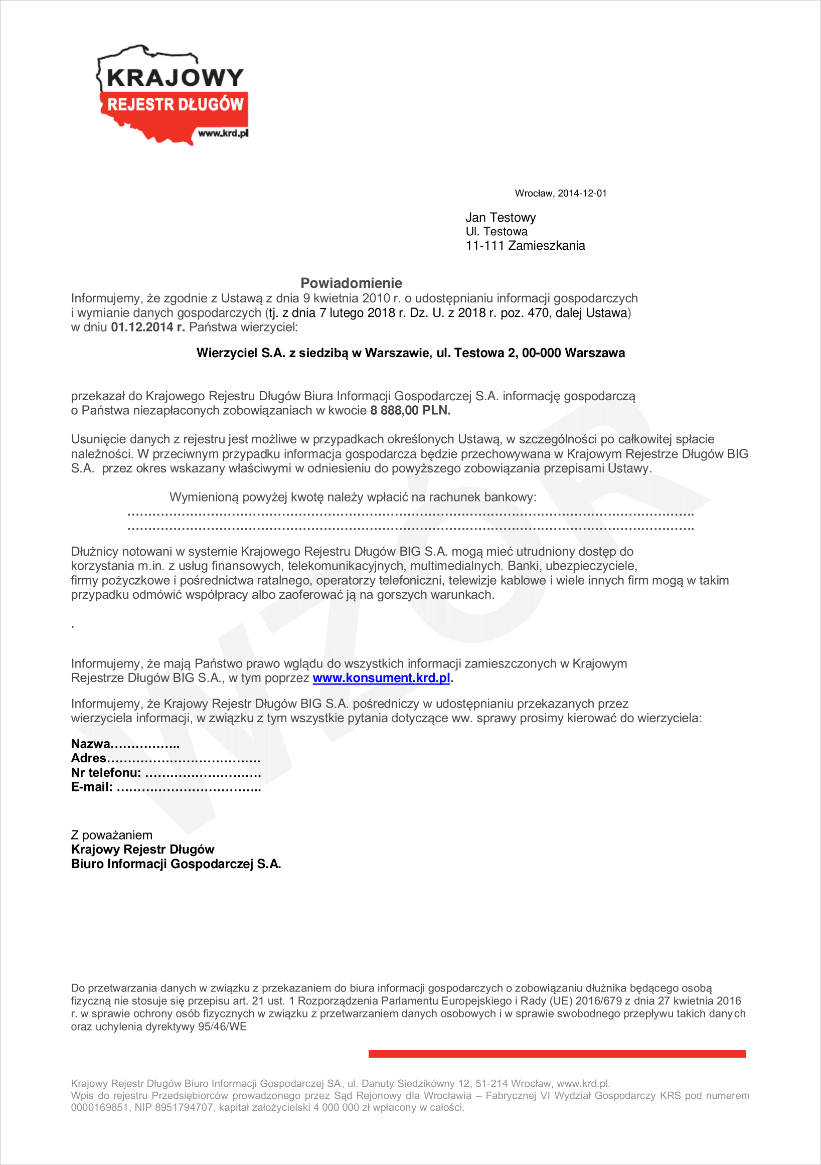 Wezwanie do zapłaty z klauzulą KRD BIG S.A.